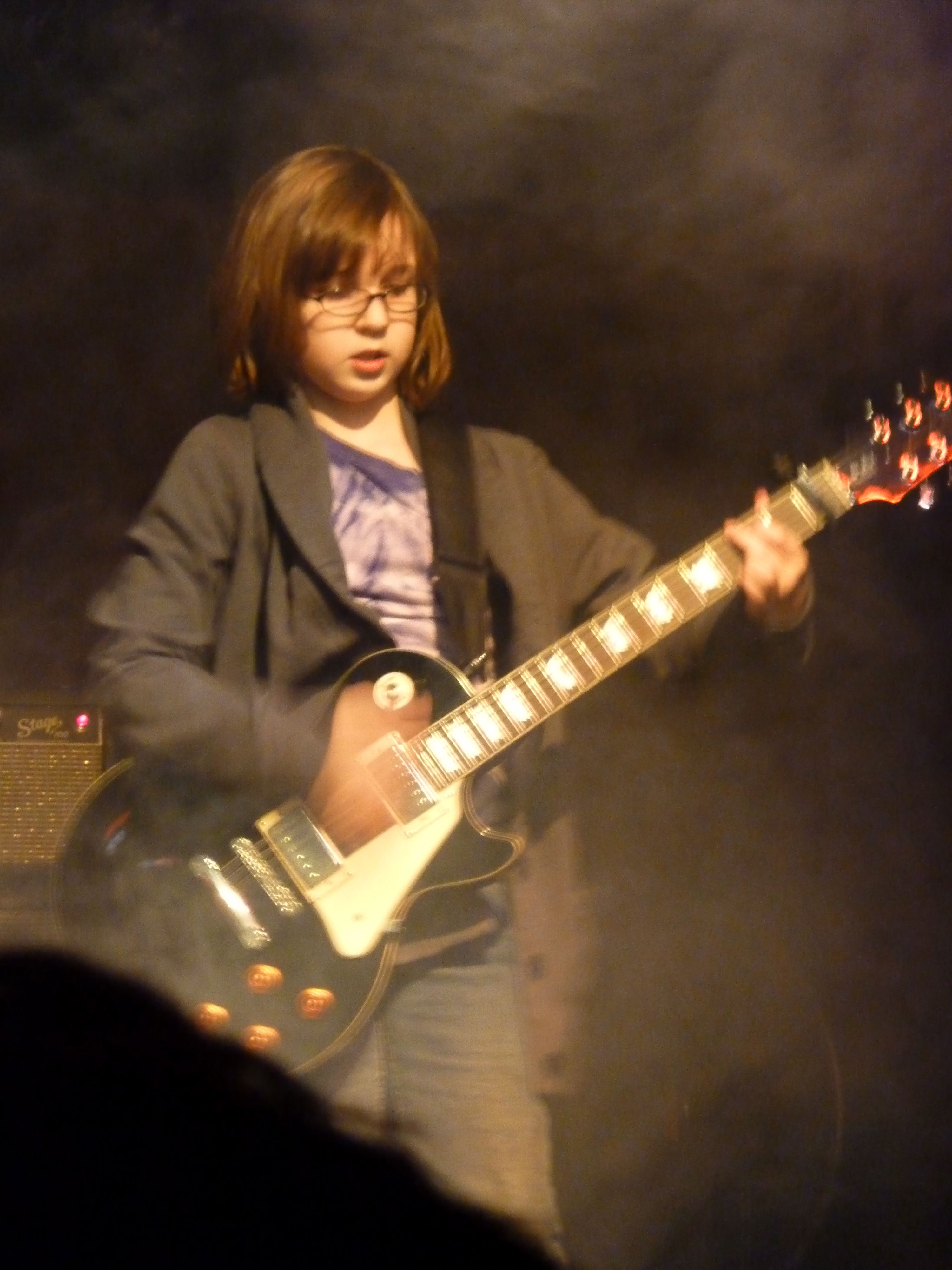 She participates in The School of Rock – her primary weapon is the electric guitar, but she is equally thrilled to sing, play percussion, and even throw in a little bass action.