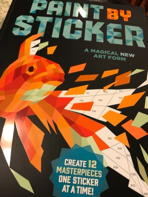 While I try to get myself fired up to make that happen I thought maybe a little more active relaxation would be more accessible. My son had gotten his sister this cool sticker coloring book for her birthday (read: I bought it for her and put his name on the card) and at the time I thought it looked like it might be a fun, calming sort of activity. So I ordered myself a similar book as my “modified meditation” activity.