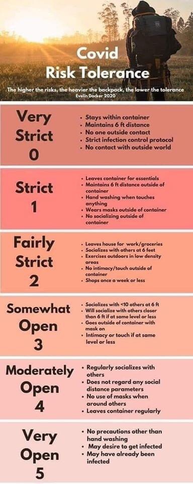 I’m a 1.5 or so. I’m not going to work. I do go out once every week or 10 days for milk and fresh food. I go for walks without a mask. But I do wear one anytime I am actually near people outside of my “isolation pod” which is basically my kids, my parents, and a couple of friends.